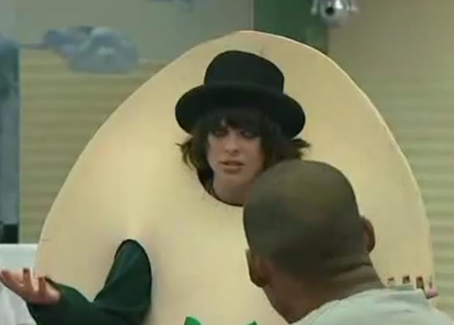 BB orders all Humpty Dumpties to make their way to the garden and stand in front of the wall. Absurdly, we hear Mario call out 'Josie, your moustache!' (not a sentence normally associated with Josie .. that is until she discovered she'd had one all along on John's final day in the house)She wanders back into the search on the hunt for her facial hair.