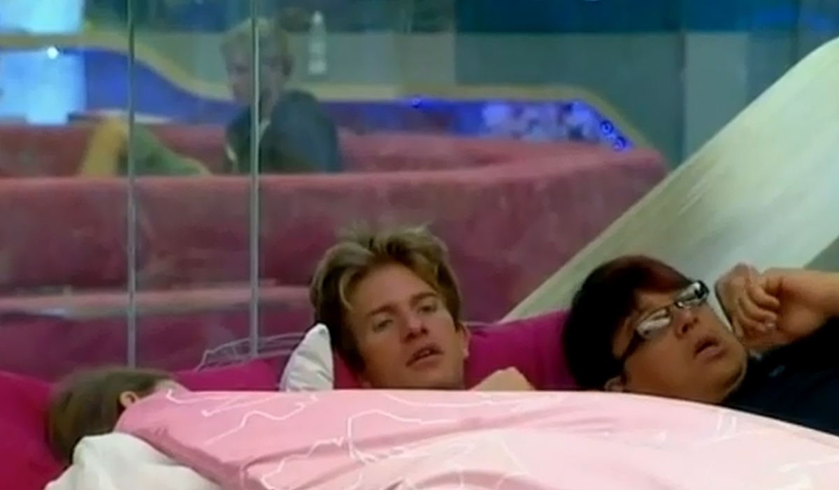 Some of the HM's are in the bedroom. Ben is badmouthing John while in between Dave and Sunshine in her bed. He thinks some people can tease and take being teased back and others can't.. John is one he is referring to. He advises Sunshine not to take it personally as John really likes her.